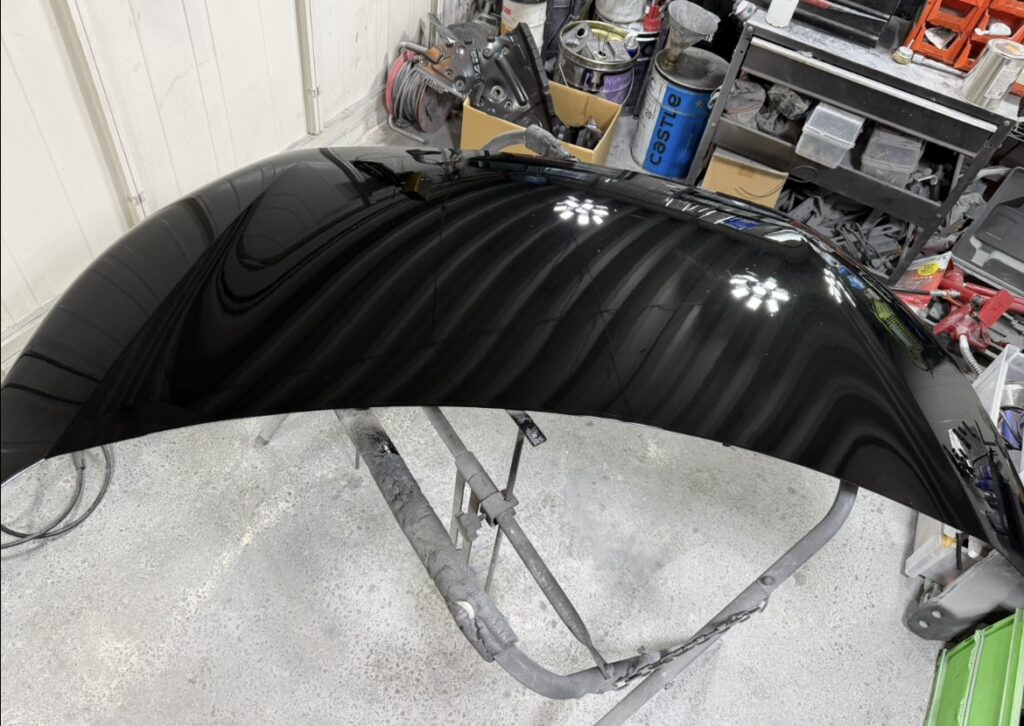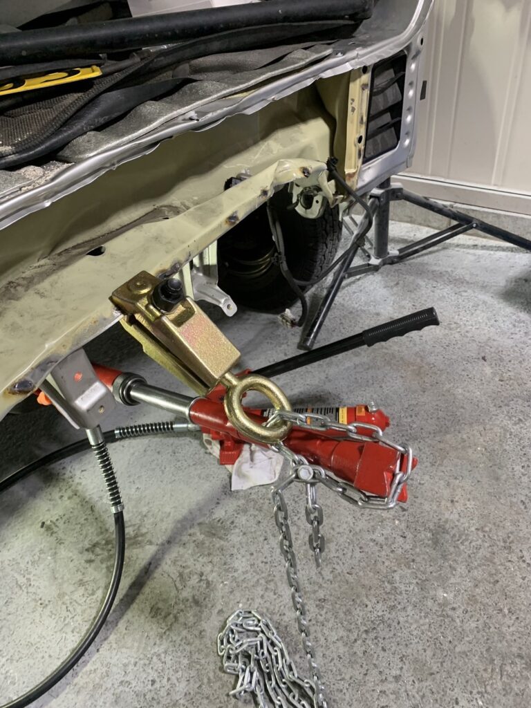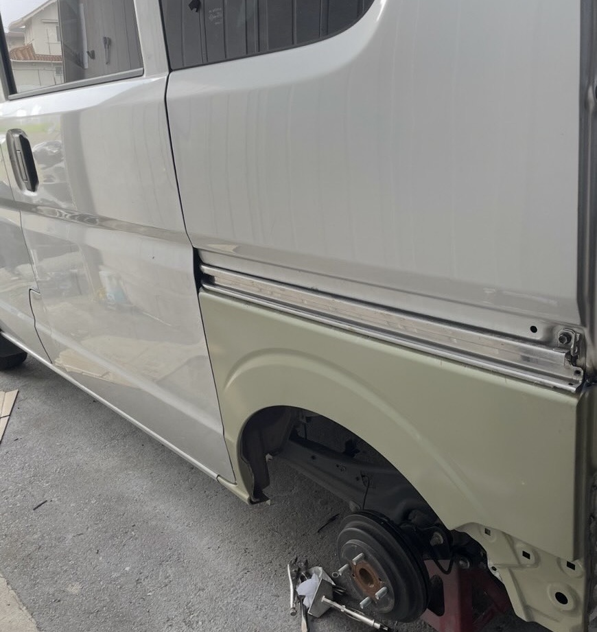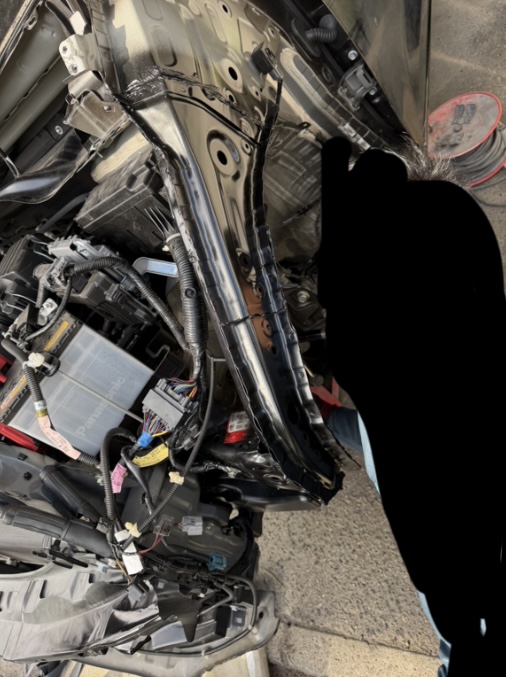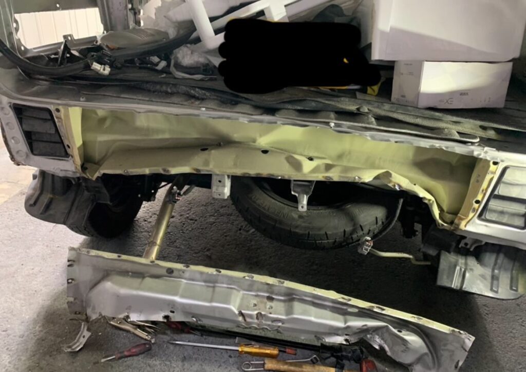 バックパネルをフレーム(車体骨格部)修正機を使用し引っ張ったり叩いたり部品を交換したりして元の状態に戻すため修正していきます。