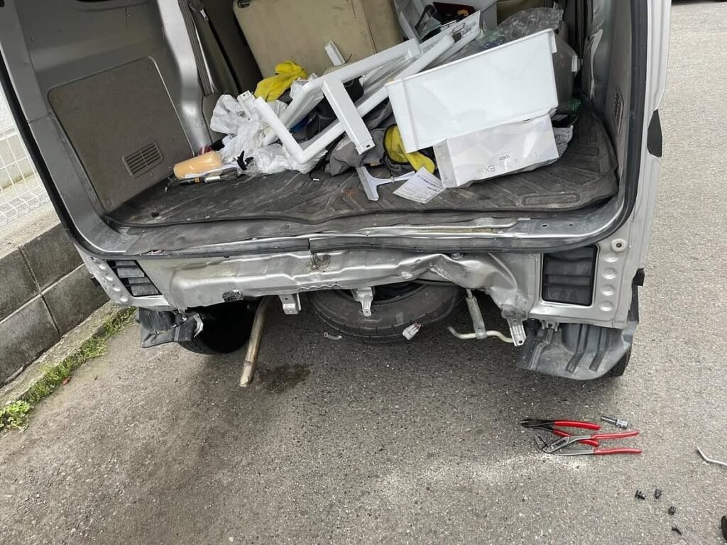 後ろから停車中に突っ込まれた直後のお写真です。大きなお怪我がなくてなによりです。警察に連絡しお互いの保険会社に連絡し保険会社の絡む修理が決定した段階で迅速に代車をご用意し損傷の確認をしたところ、、
