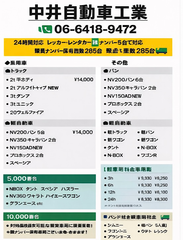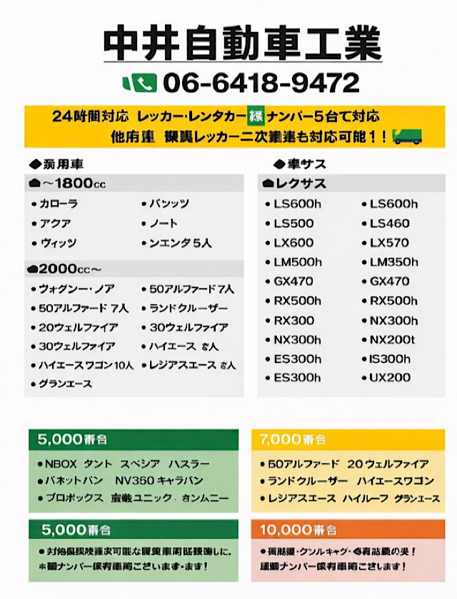 ご準備している代車は200台以上です。軽自動車からノア ヴォクシーはもちろんアルファード、レクサス、黒ナンバーの箱バンからレッカー車や冷凍車のレンタカーまで幅広くご用意しており大変喜ばれております